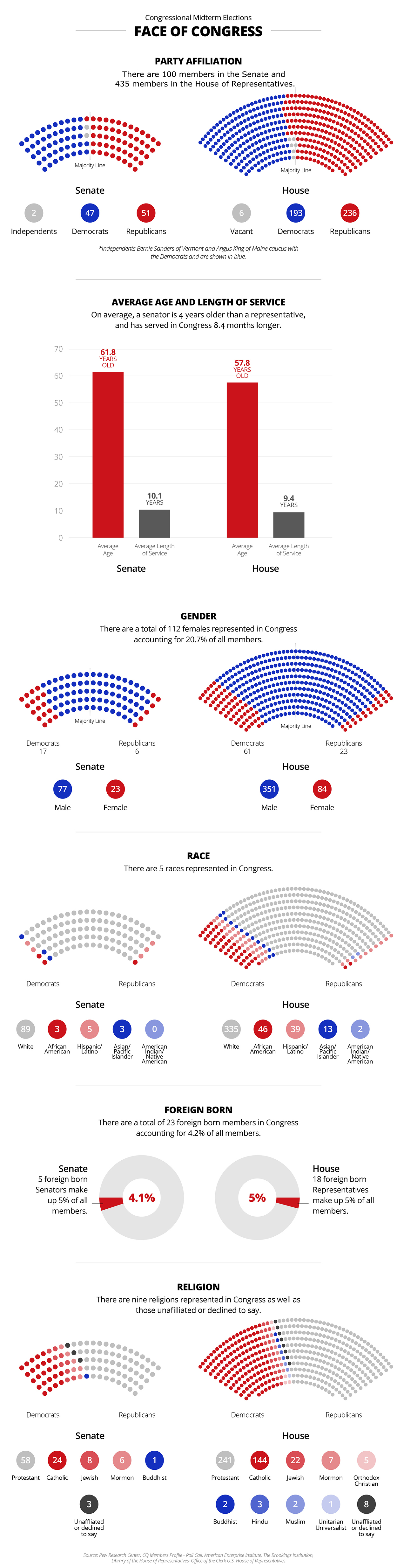 The current 115th Congress is the most racially and gender diverse in history, with more women serving in the Senate than ever before, according to data from Pew Research Center and Congressional Quarterly. Women and minorities each constitute just under 20 percent of all House and Senate members. But the percentage of female lawmakers is likely to increase substantially after the November midterm election. That’s because a record 200 female House nominees are headed for the general election, with many likely or certain to win, according to an analysis by the New York Times. Here is a look at the demographic makeup of the current House and Senate members who took office in early January 2017: