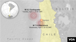 The U.S. Geological Survey said a 7.8-magnitude earthquake was detected late Wednesday night about 23 kilometers south of Iquique, at a depth of 20 kilometers below sea level. The aftershock prompted authorities to issue a new tsunami alert along the Chilean coast and order the evacuation of thousands of coastal residents.