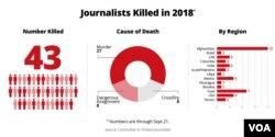 The Committee to Protect Journalists reports that 43 journalists have been killed in the line of their work so far in 2018. Last year, there were 46 deaths for all of 2017. The numbers aren't that unusual and, in fact, have been higher: 73 in 2015 and 2013, 74 in 2012, the committee said.
