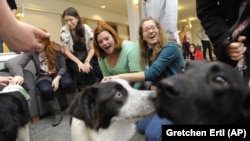 Law students Josh Richey, right, and Lindsay Stewart play with Hooch, a 19-month-old golden retriever and Stanley, a 4-month-old golden retriever, in between final exams at Emory University in Atlanta.