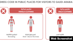 Saudi Arabia also has dress code for foreigner visitors, called the “Public Decorum Charter,” which describes the types of prohibited clothing in both words and illustrations.