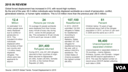 "Twenty-four people are displaced every minute," said UNHCR chief Filippo Grandi. "Two-thirds of the forcibly displaced are internally displaced. Ninety percent of the forcibly displaced are displaced in poor or middle-income countries, not in the rich world."