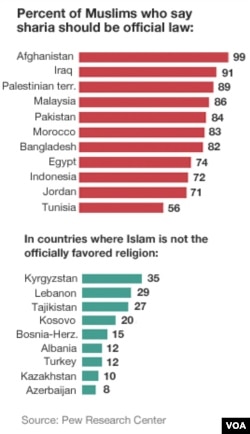 Its focus was on Muslim views on religion and politics. One of the key findings was that six in 10 Muslims in the Middle East and nearly eight in 10 in sub-Saharan Africa believe their national laws should be based on the Islamic code of sharia. In Afghanistan, the figure was 99 percent.
