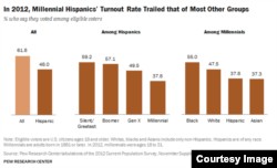 There are several factors to blame, Pew said. One of them is that turnout rates for Latinos have historically been lower than those of other groups. In 2012, less than 48 percent of Hispanic eligible voters went to the polls, whereas 64.1 percent of whites and 66.6 percent of blacks cast votes.