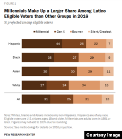 Millennials, generally defined as those born in 1981 or later, make up 44 percent of the record 27.3 million Hispanic eligible voters for 2016, according to a Pew Research Center study released Tuesday. That means there are more Hispanic millennials than millennials in any other racial or ethnic group.