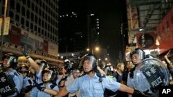 Dozens of police with shields and helmets pushed into a crowd of protesters gathered at barricades in the Mong Kok district. The Associated Press said 20 people were injured in the melee.