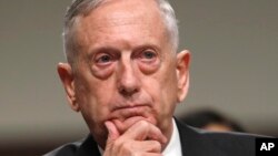 FILE - Defense Secretary Jim Mattis listens while testifying on Capitol Hill in Washington, June 13, 2017, before a Senate Armed Services Committee hearing on the defense department's budget.