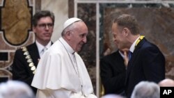 Pope Francis was presented with the International Charlemagne Prize for his “message of hope and encouragement" Friday at the Vatican.