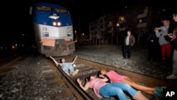 Earlier, dozens of protesters stopped an Amtrak train in Berkeley by lying on the tracks or sitting on a sofa placed across the line.