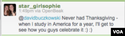 “The first thing I noticed about Thanksgiving is that there seems to be a shift in gears, slowing down and taking more time with each other. What I don't understand is why this coming together happens just once a year." – Saudi Arabian University of North Alabama student Naelh Alzain in The Times Daily