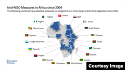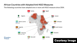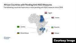 The report says anti-NGO measures are pending or possible in Egypt, Malawi, Mozambique, Rwanda, Sudan and Zambia.