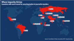 Afghanistan ranks fifth on the list, with at least 17 unsolved killings of journalists over the past decade, including at least four journalists who worked for Radio Free Europe/Radio Liberty, a sister organization of VOA.