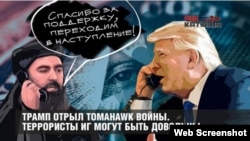 Fontanka.ru website published a photo-shopped poster depicting President Trump speaking over the phone with what appears to be the Islamic State leader Abu Bakr al Baghdadi (who Russia claims it killed in a strike a year ago). The caption reads “Trump opened the Tomahawk of war. IS terrorists shall be happy,” with “al-Baghdadi” telling the U.S. president, “Thanks for the support. Now we advance.”