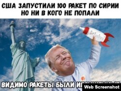 A caricature distributed in Russia’s most popular social network vKontakte says, “The U.S. launched 100 missiles in Syria, but did not hit anybody. Obviously, the rockets were toys.”