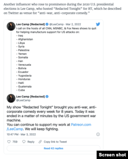 Another influencer who rose to prominence during the 2020 U.S. presidential elections is Lee Camp, who hosted “Redacted Tonight” for RT, which he described on Twitter as venue for “anti-war, anti-corporate comedy.”