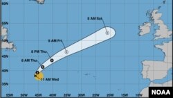 Ernesto is centered about 695 miles (1,120 kilometers) southeast of Canada's Cape Race, Newfoundland, and is moving north near 8 mph (13 kph).