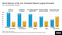 The United States' overall ratings also remain mostly positive, according to the Pew Research Center poll, which looked at public opinion in 40 nations. A global median of 69 percent expressed a favorable opinion of the country.