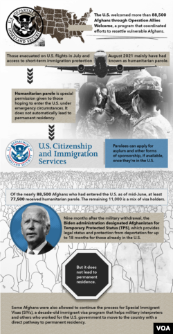 These Afghans were evacuated on U.S. flights in July and August 2021 and mainly have received a short-term immigration protection known as humanitarian parole.
