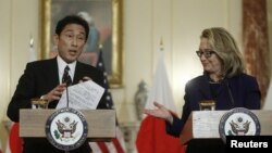The United States is urging new leaders in China and Japan to find a peaceful way to settle their long-standing territorial dispute over islands in the East China Sea. U.S. Secretary of State Hillary Clinton met Friday with Japanese Foreign Minister Fumio Kishida to discuss the standoff.