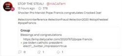 Posts on Parler are called “parlays.” One on Thursday, under the hashtag #StoptheSteal, said “Shocker Pro Marxist Pope Francis congratulates Crooked Joe!”