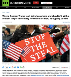 Just days earlier in a RT opinion piece, Dupree slammed what he described as “the fraudulent and brazen behavior of these Democrats to destroy the election’s integrity.”