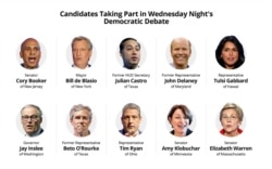 The other candidates debating Wednesday include Washington state Governor Jay Inslee, former Housing and Urban Development Secretary Julian Castro, Hawaii Rep. Tulsi Gabbard, New York City Mayor Bill DeBlasio, Ohio Rep. Tim Ryan and former Maryland Rep. John Delaney.