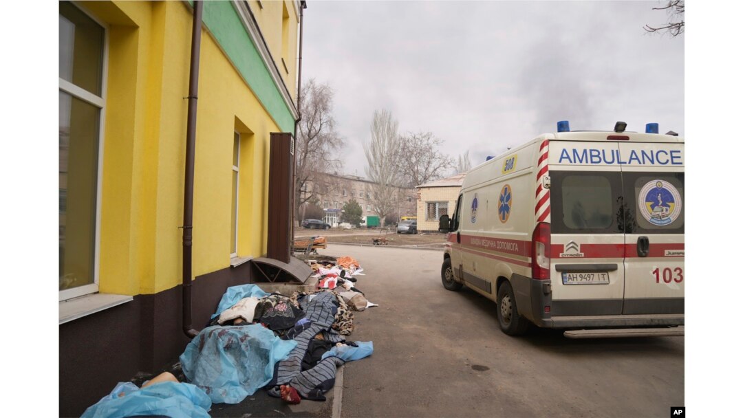 Bodies of people killed by shelling lay covered outside hospital number 3 in Mariupol, Ukraine, March 15, 2022.