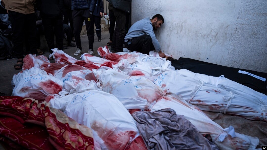 Palestinians mourn relatives killed in the Israeli bombardment of the Gaza Strip at a hospital morgue in Rafah, Feb. 12, 2024. The Israeli military said early Monday that it had rescued the two hostages from captivity in the Gaza Strip.