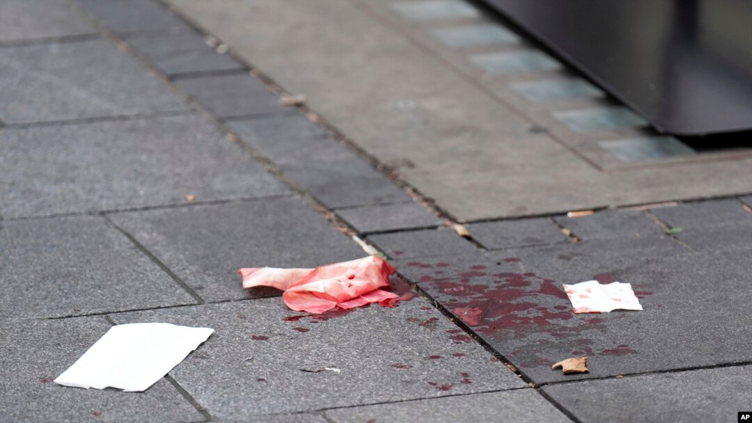 Blood is seen on the pavement in Leicester Square, in London, Aug. 12, 2024.