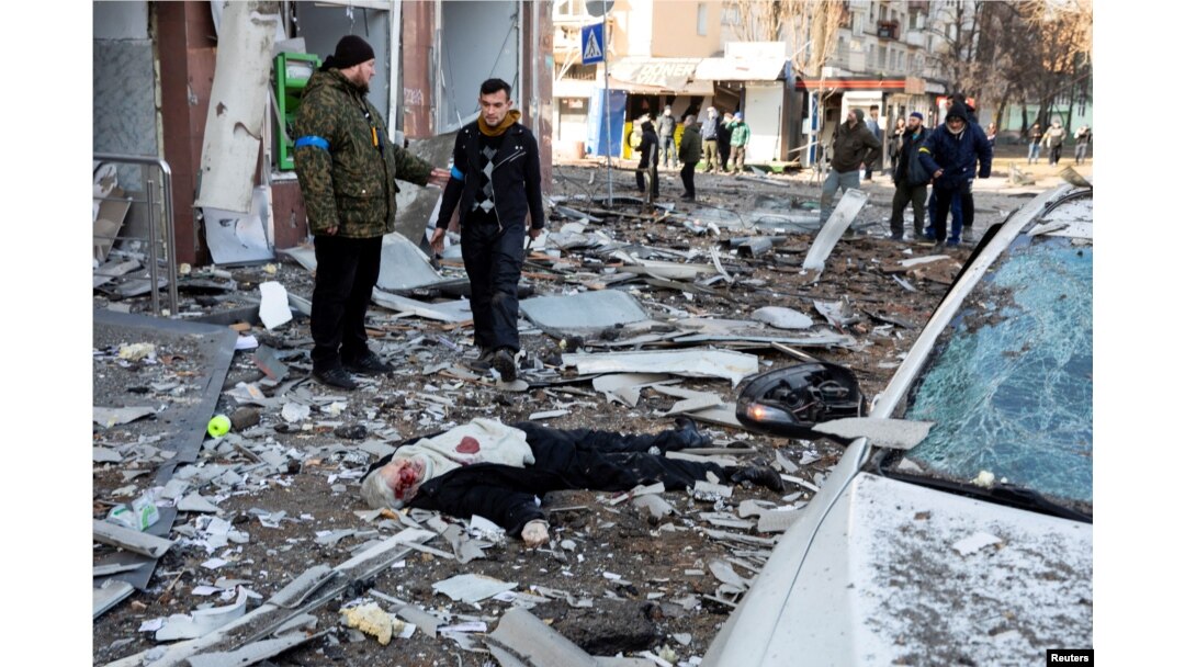 A body of a person is seen on ground near a building destroyed by shelling as Russia's attack on Ukraine continues, in Kyiv, Ukraine, March 14, 2022.