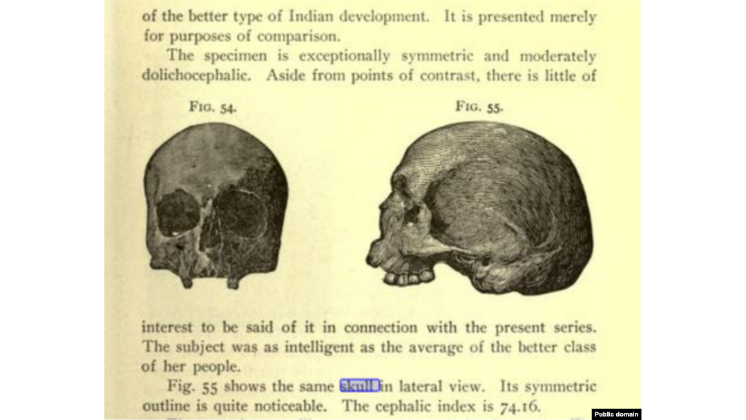 A screenshot from "The Diseases of Society" by G. Frank Lydston shows an illustration of a skull alleged to have belonged to a Hunkpapa woman who died at Wounded Knee.