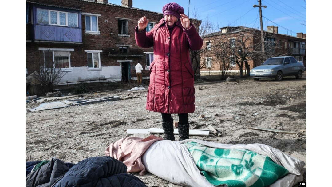 A woman mourns the victims of a missile strike in the town of Panteleimonovka in a Russian-controlled part of Donetsk region, Feb. 17, 2024.